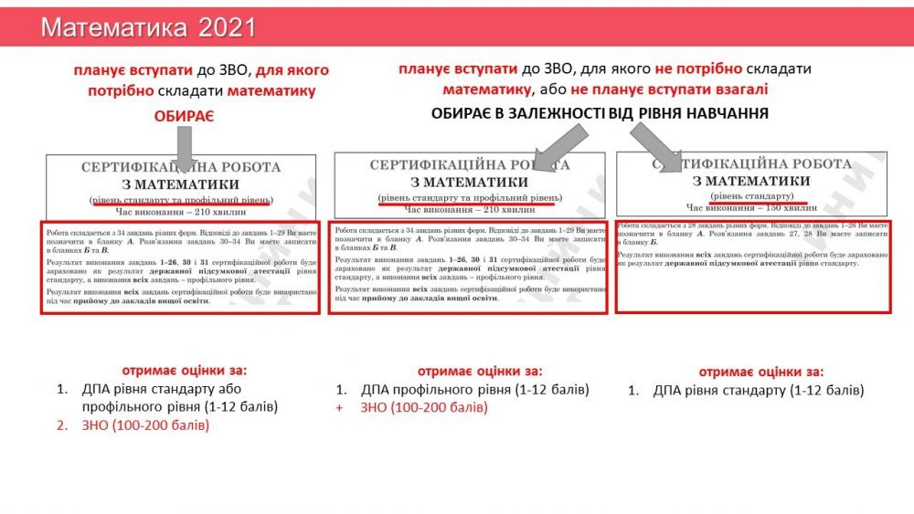 Учням, які виберуть для проходження ДПА математику, оцінку за ДПА (за шкалою -1-12 балів) буде визначено залежно від рівня, на якому вони цей навчальний предмет вивчали. Для тих, хто вивчав математику на профільному рівні, оцінкою за ДПА буде результат виконання рівня стандарт та профільного рівня.