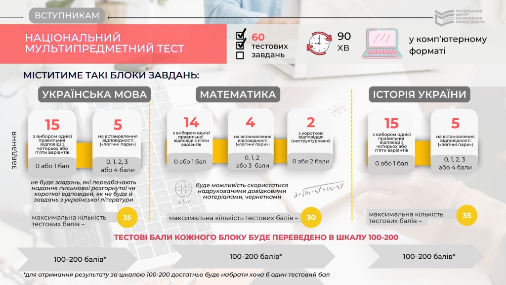 У 2022 році вступ абітурієнтів, які претендують на бюджетну форму навчання або вступають на висококон’юнктурні спеціальності на контракт, буде відбуватися за результатами спрощеного ЗНО – національного мультипредметного тесту (НМТ).