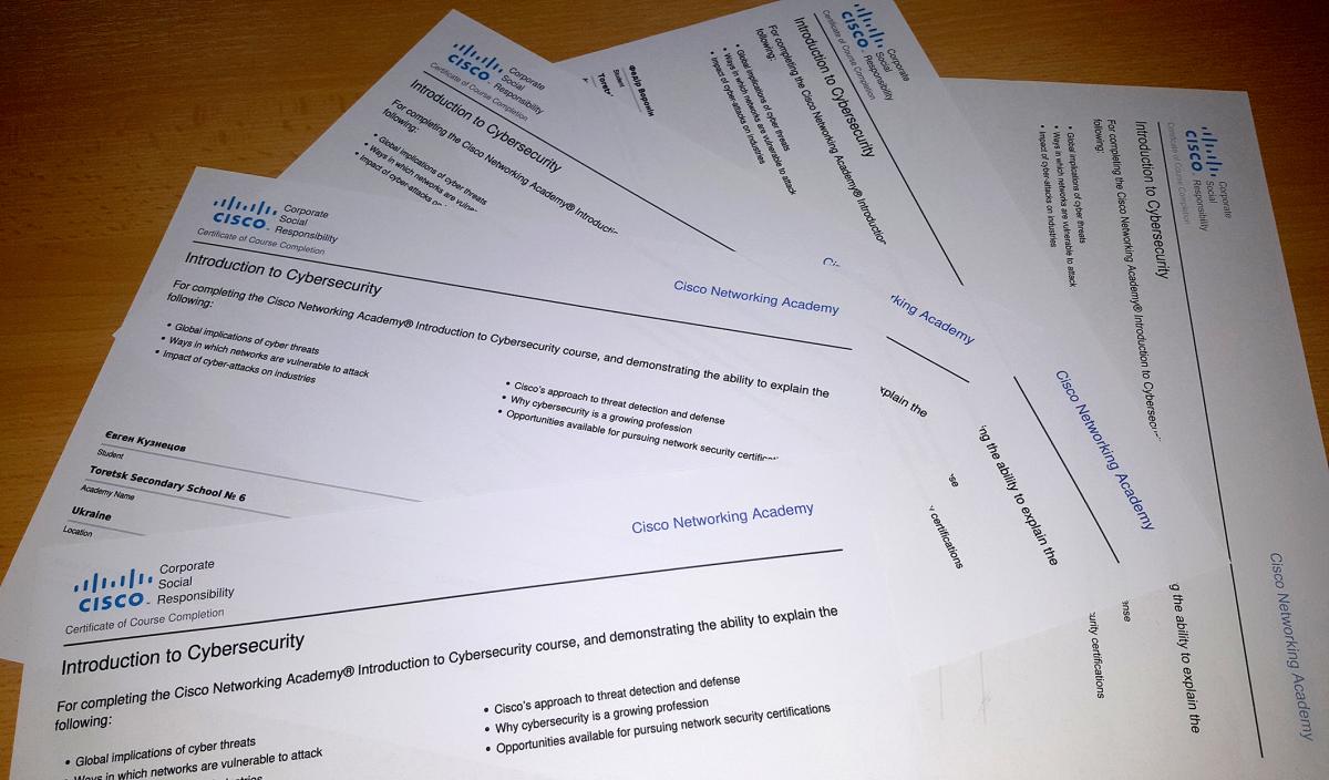 У квітні цього року 47 учнів 10-11 класів Опорного закладу в умовах карантину успішно склали випускний іспит та отримали сертифікат про завершення курсу Мережевої академії Cisco «Вступ до Кібербезпеки».