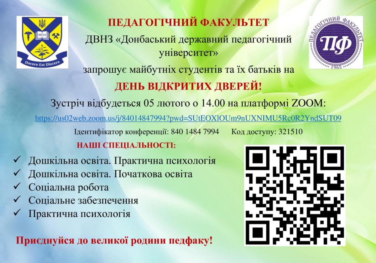 ДВНЗ «Донбаський державний педагогічний університет» (м.Слов’янськ) педагогічний факультет запрошує учнів 10-11 класів та їхніх батьків на День відкритих дверей, який відбудеться 05 лютого 2022 року (субота) о 14.00. у ZOOM: https://us02web.zoom.us/j/84014847994?pwd=SUtEOXlOUm9nUXNIMU5Rc0R2YndSUT09