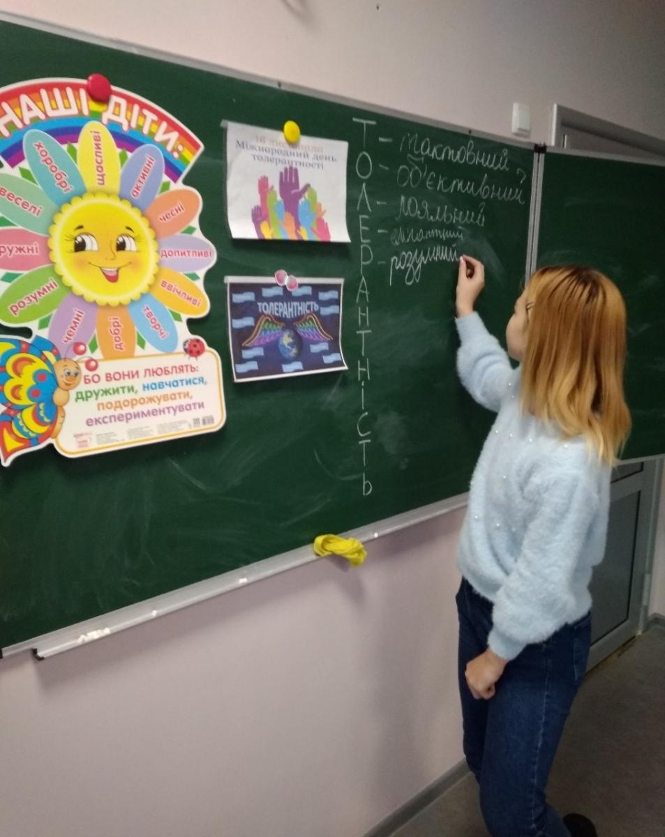 Під час проведення  «Тижня  толерантності» класні керівники залучили дітей  до участі  у виховних заходах: відеоподорож «Планета  ТОЛЕРАНТНОСТІ» (1-2кл.), тренінг «Складаємо квітки толерантності»  (3-4 кл.); рольови ігри «Ми діти великої шкільної родини» (5-ті кл.), «Я серед своїх» (6-ті кл.); мультимедійна презентація з елементами тренінгу «Світ навколо мене» (7-8 кл.), урок-тренінг «Толерантність та емпатія» (9-11 кл.)